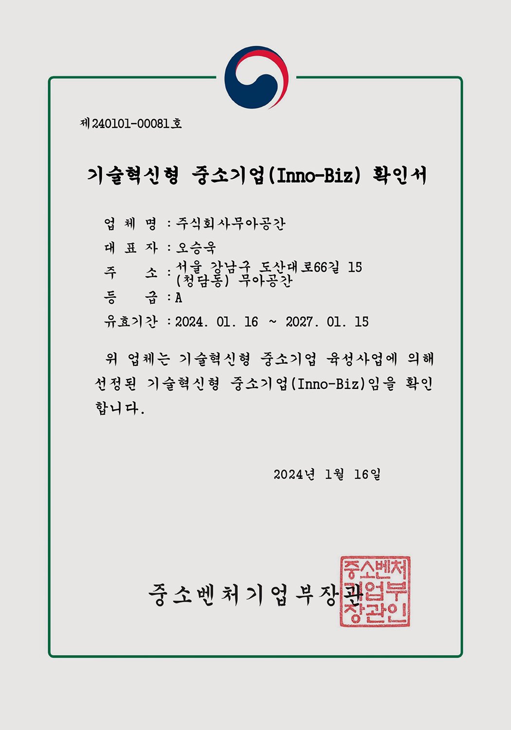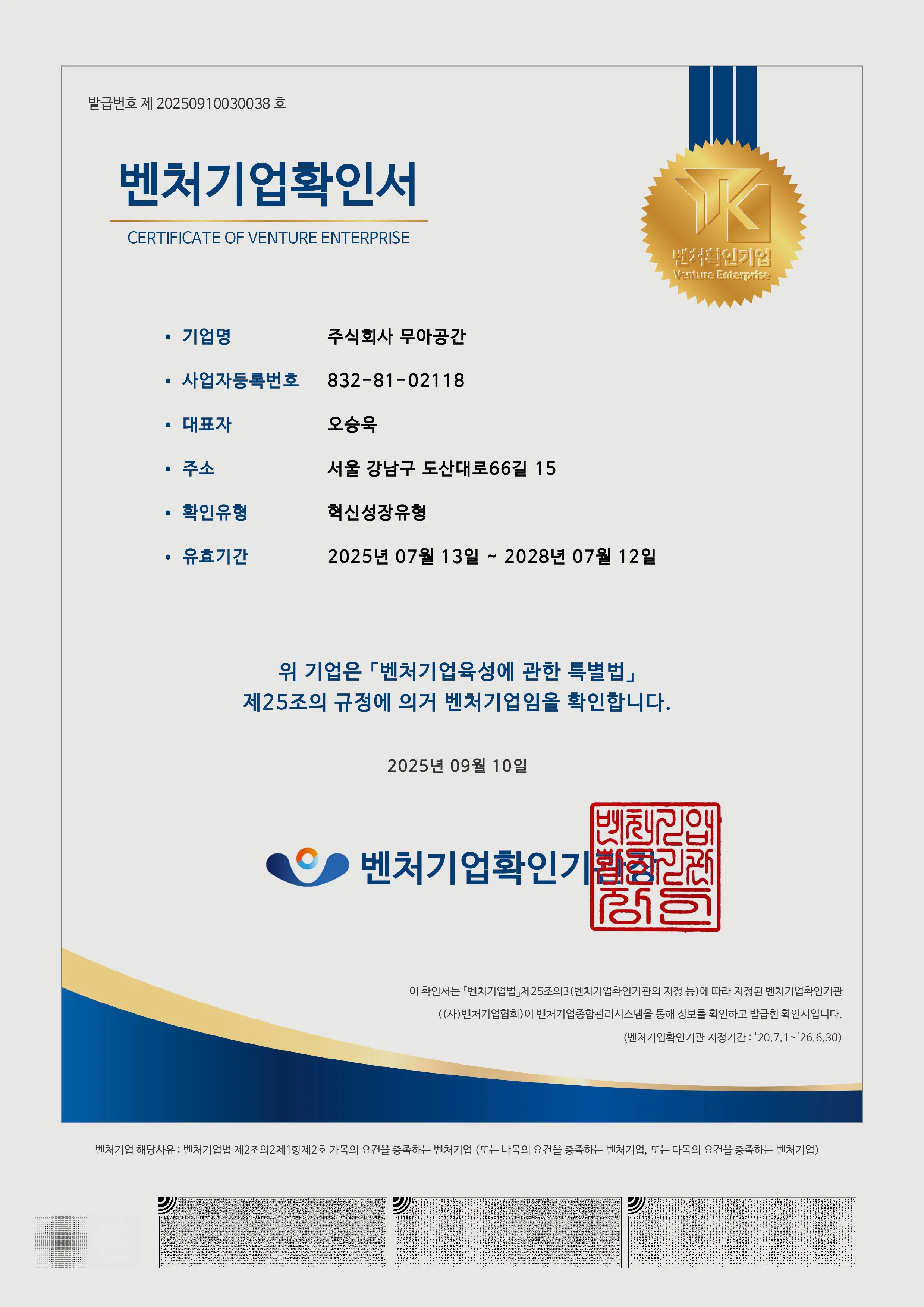 무아공간은 국가 공인기관에서 벤처기업과 기술혁신형 중소기업 인증을 받았습니다.