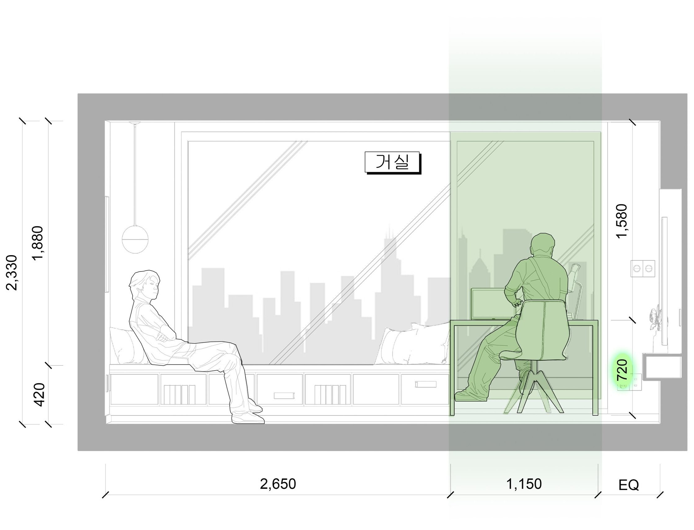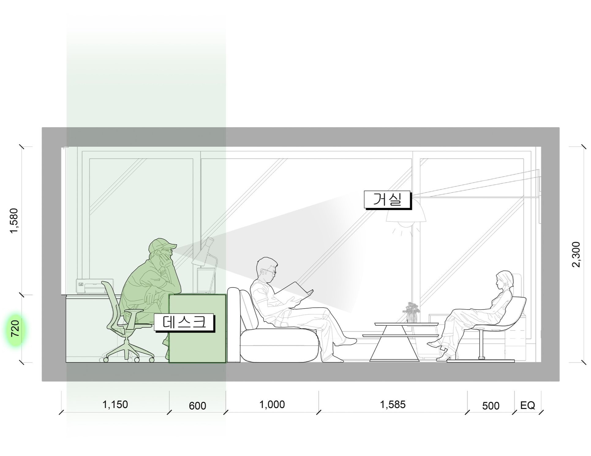 • 데스크(높이 720mm) 앞 배치된 소파의 등받이 높이가 900mm를 넘지 않아야 업무공간에서 탁 트인 시야가 확보됨