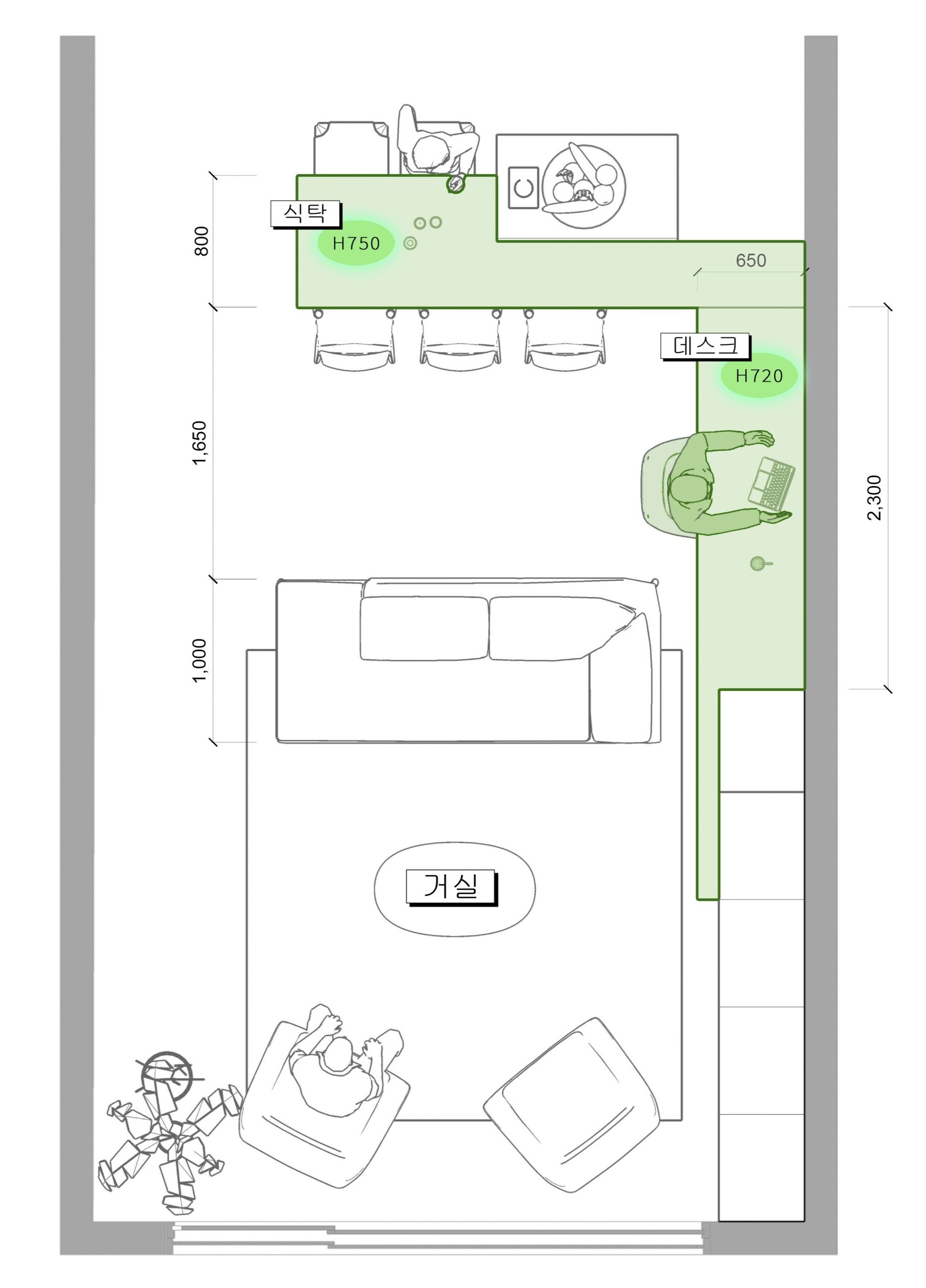 • 거실 한쪽 벽면에 600~700mm 깊이의 데스크 배치