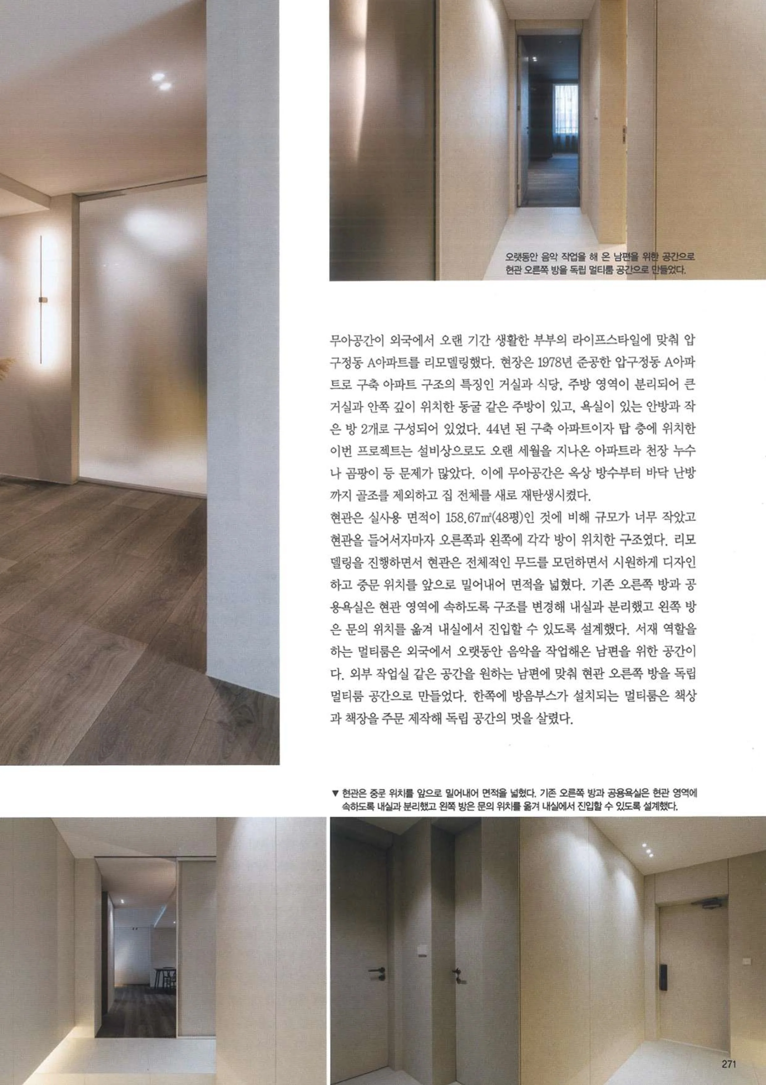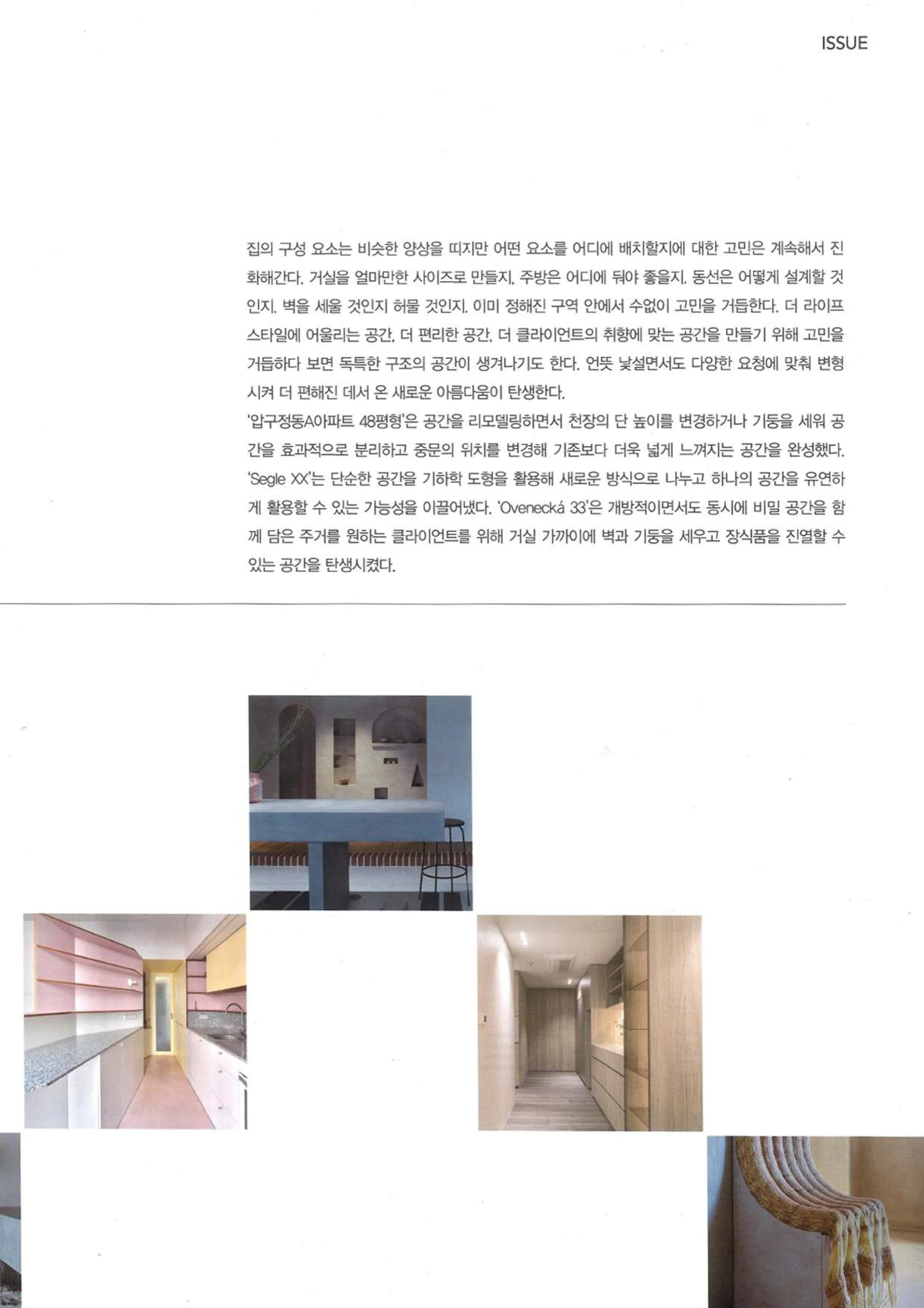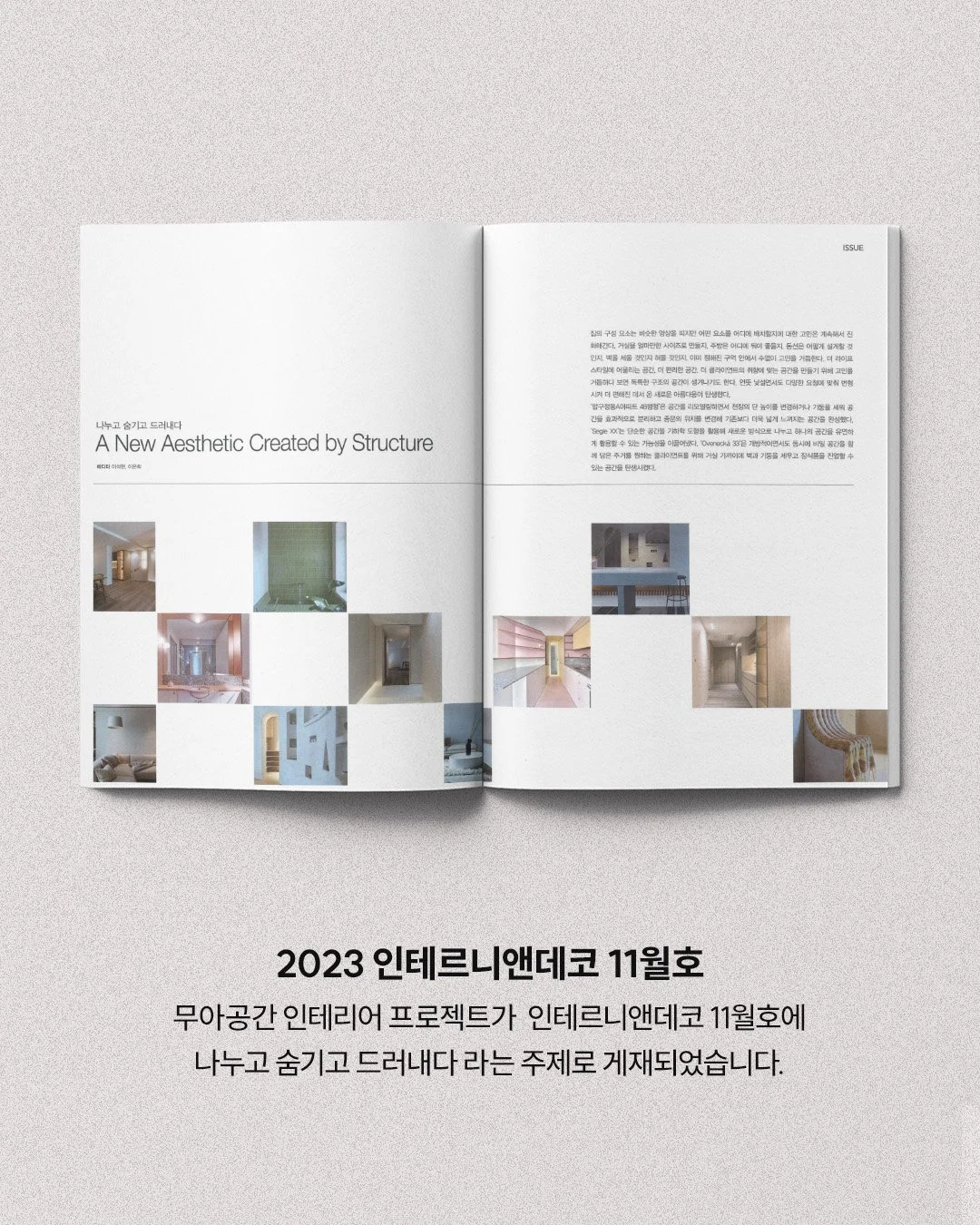 인테르니앤데코 (2023/11) 인테르니앤데코 2023년 11월호에 무아공간 압구정동A아파트 프로젝트가 ‘나누고 숨기고 드러내다’라는 주제로 게재되었습니다. 더 자세한 내용은 지면을 통해 확인해 주세요. 포트폴리오 YOUTUBE