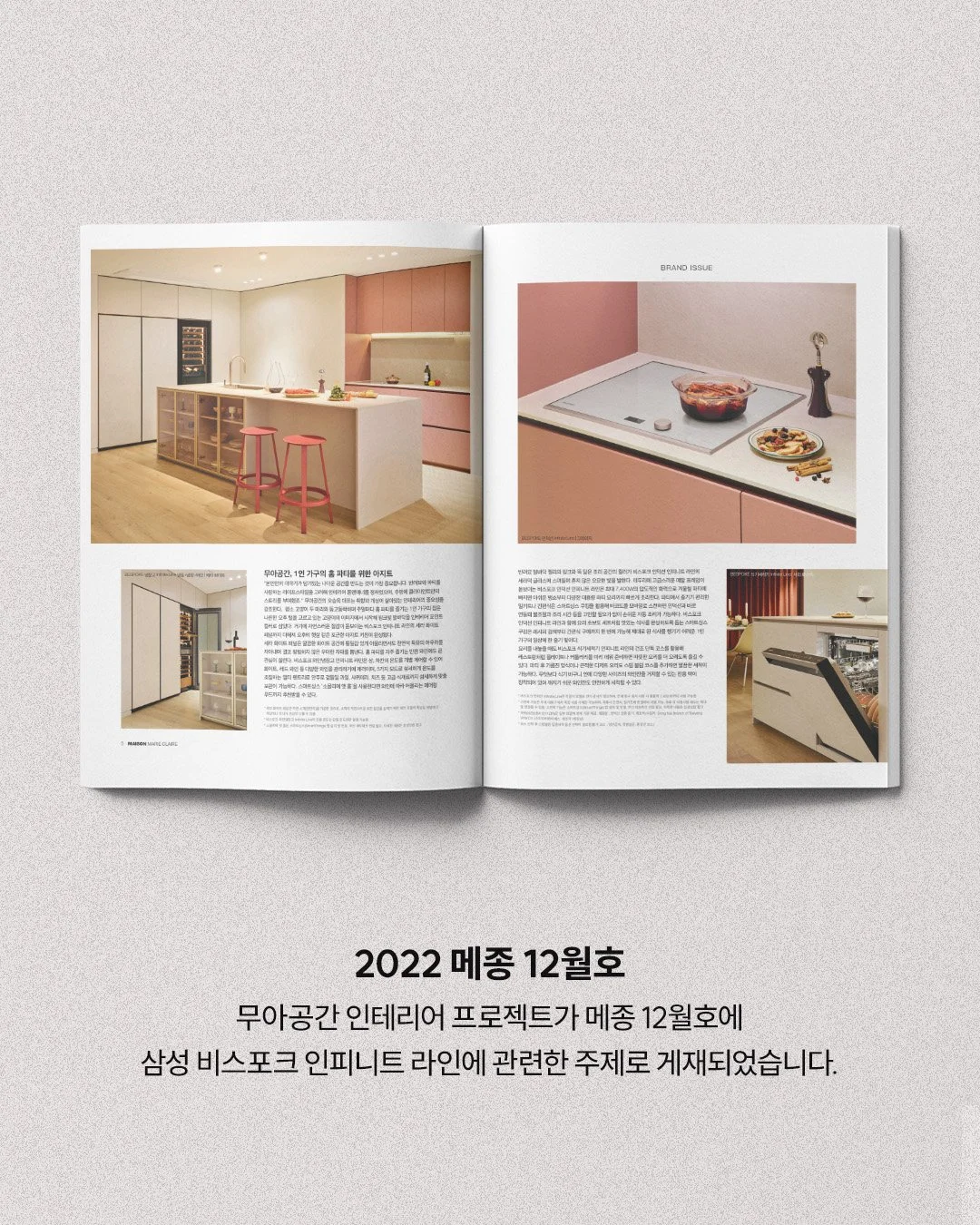 메종 (2022/12) 메종 2022년 12월호에 무아공간 도곡동B아파트 프로젝트가 ‘삼성전자 BESPOKE Infinite Line’과 관련된 주제로 게재되었습니다. 더 자세한 내용은 지면을 통해 확인해 주세요. 포트폴리오 YOUTUBE